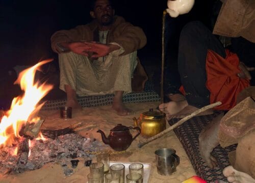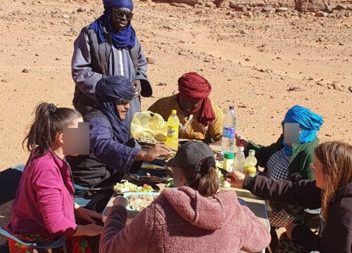 Wstajemy razem ze wschodem słońca. Zwiedzamy, chłoniemy pustynię, około południa docieramy na biwak. Po obiedzie czas wolny, odpoczywamy, drzemiemy w cieniu, co jest niezbędne podczas saharyjskich upałów. Potem dalsza część zwiedzania, a po ciepłej kolacji najczęściej zostajemy przy ognisku, pijemy tuareską herbatę parzoną na ogniu i poznajemy kulturę naszych opiekunów, podczas rozmów i zgadywanek. Może któryś zagra nam też na gitarze i zaśpiewa?